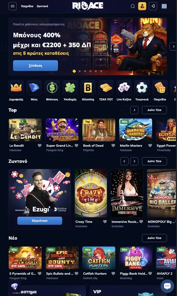 Για παίκτες που αναζητούν μια αξιόπιστη επιλογή καζίνο RioAce Ελλάδα, διατηρούμε τον ίδιο κατάλογο παιχνιδιών και τα ίδια εργαλεία λογαριασμού διαθέσιμα και στο κινητό. Θα δείτε γνωστούς παρόχους, ξεκάθαρες πληροφορίες μπόνους και την ίδια περιοχή τραπεζικών συναλλαγών για καταθέσεις και αναλήψεις. Πολλά από τα παιχνίδια μας εμφανίζουν μέσο RTP γύρω στο 96%, κάτι που σας βοηθά να κατανοείτε τι να περιμένετε σε βάθος χρόνου.